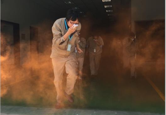 3、60人在員工分2組演習(xí)濃煙狀態(tài)下疏散,用布毛巾、紙巾等物品濕水捂住口鼻低姿從火場(chǎng)撤出。